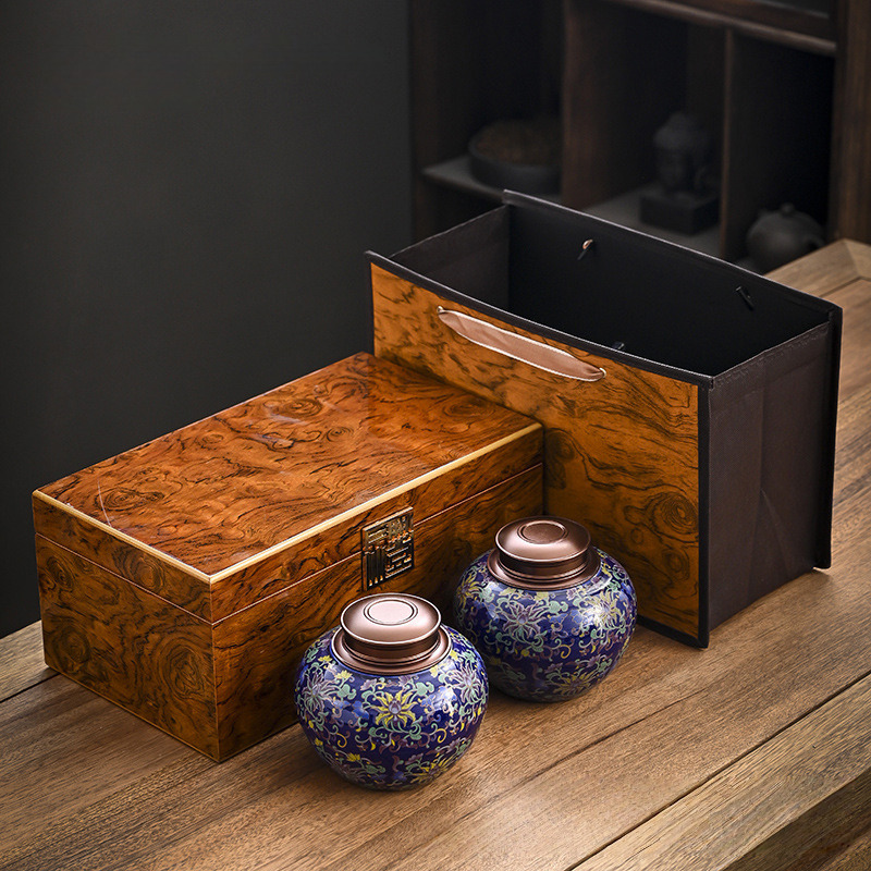 エレガントで実用的なティーギフトセットです。木目調のギフトボックスと、青と白の磁器でできた密封されたティーキャディーがセットになっています。金属製の留め具と蓋が高級感を醸し出し、付属のトートバッグがギフトをよりスタイリッシュに演出します。お茶の保存用としても、贈り物としても、上質なひとときをお過ごしいただけます。