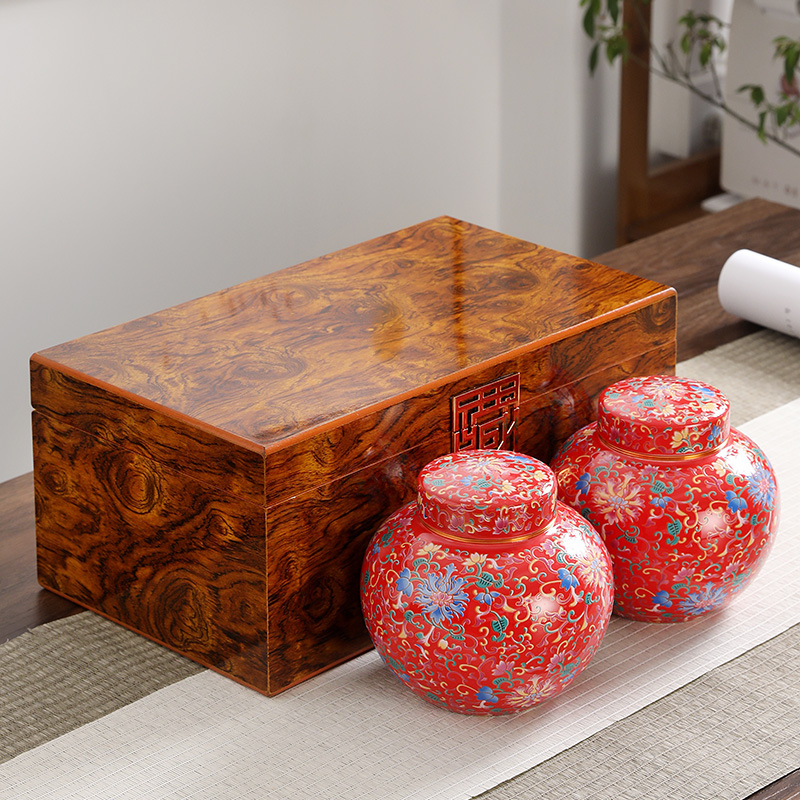 ホーロー丸型キャニスター(チャイニーズレッド、セラミック製スクリュー蓋)、ダブルキャニスター、木箱入り