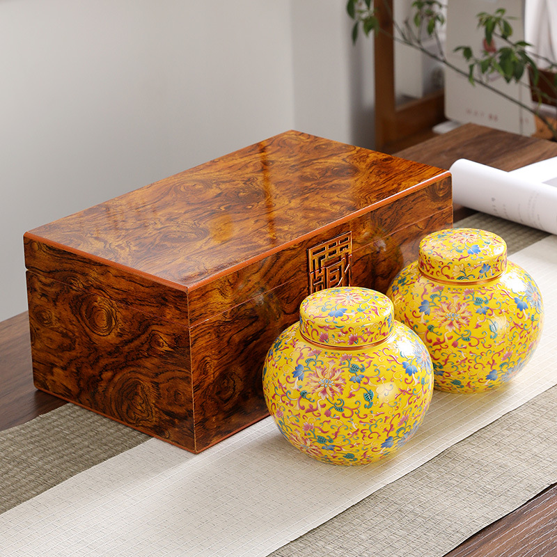 カラー:ホーロー丸型キャニスター(インペリアルイエロー、セラミック製スクリュー蓋)、ダブルキャニスター、木箱入り