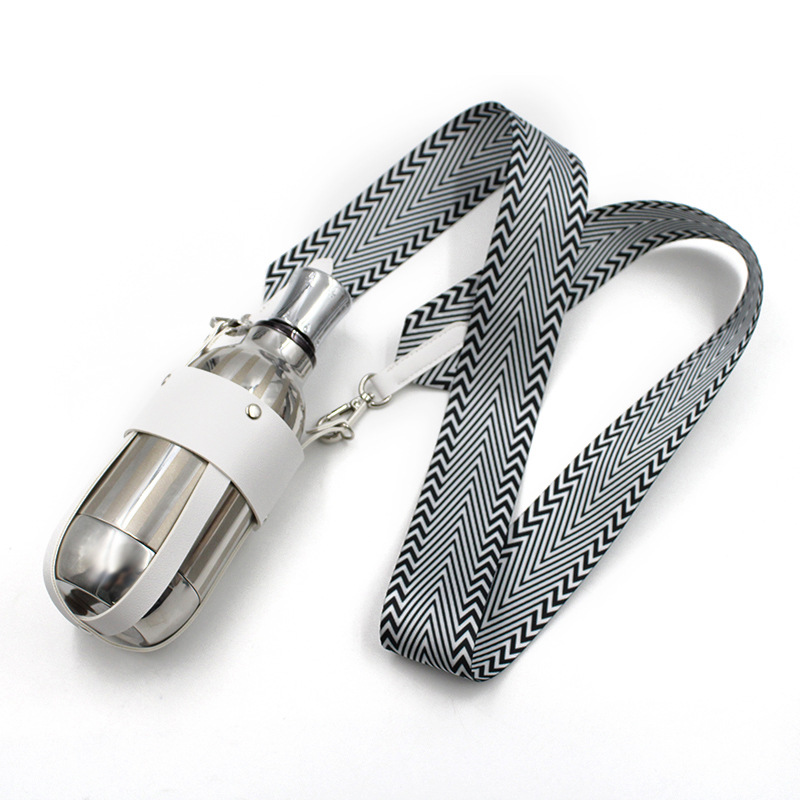 このウォーターボトルセットは、メタリックなボトル本体にホワイトレザーのストラップ、そしてヘリンボーン柄の吊り下げストラップを組み合わせた、シンプルながらもスタイリッシュなデザインです。吊り下げストラップは持ち運びやすく、アウトドアにも毎日の通勤にも最適です。飲み物を飲む瞬間に、トレンド感をプラスします。実用性と美しさを兼ね備えた、旅のお供にぴったりの一品です。