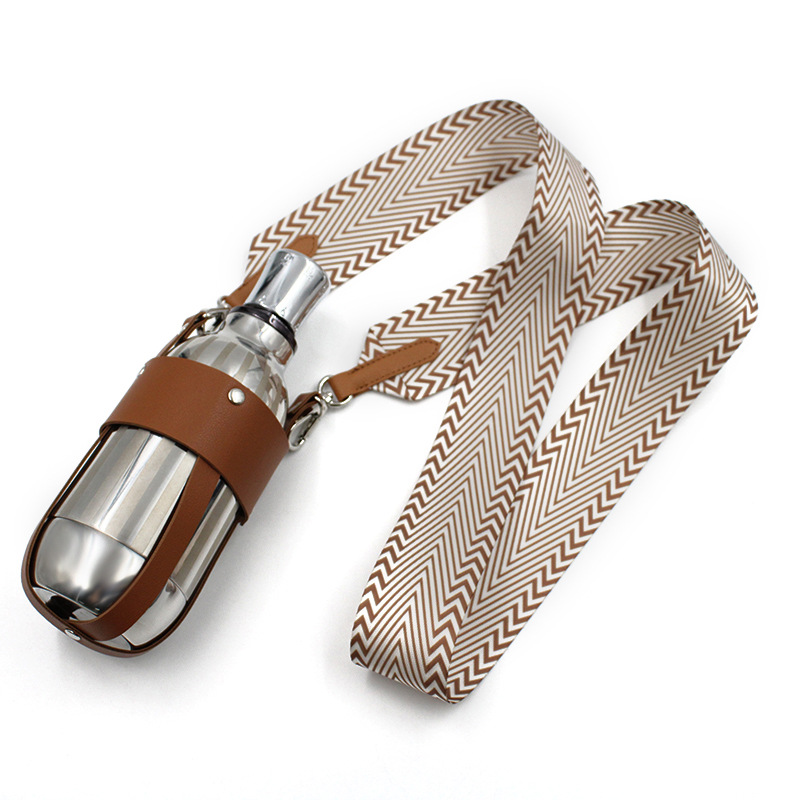 このウォーターボトルセットは、メタリックなボトル本体にホワイトレザーのストラップ、そしてヘリンボーン柄の吊り下げストラップを組み合わせた、シンプルながらもスタイリッシュなデザインです。吊り下げストラップは持ち運びやすく、アウトドアにも毎日の通勤にも最適です。飲み物を飲む瞬間に、トレンド感をプラスします。実用性と美しさを兼ね備えた、旅のお供にぴったりの一品です。