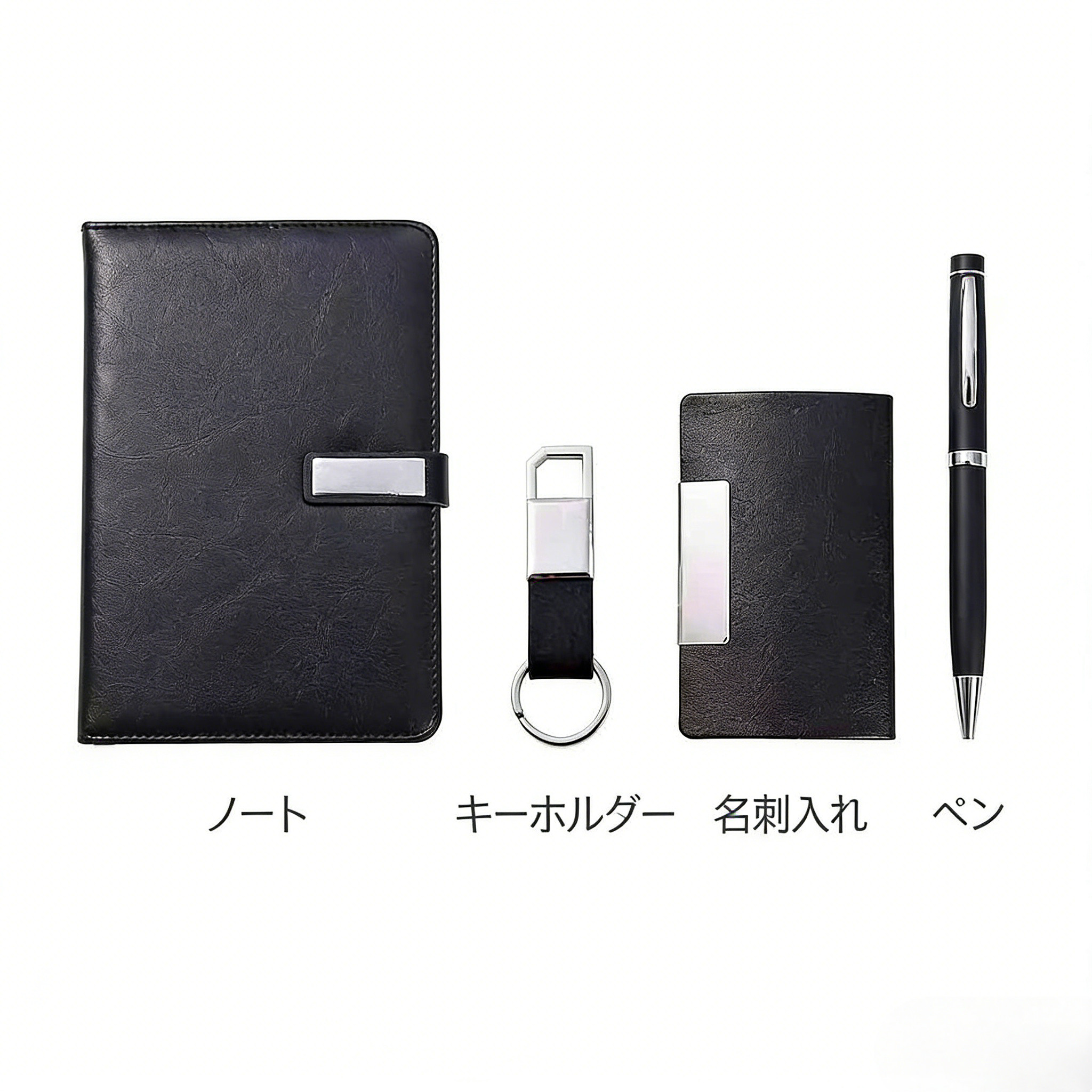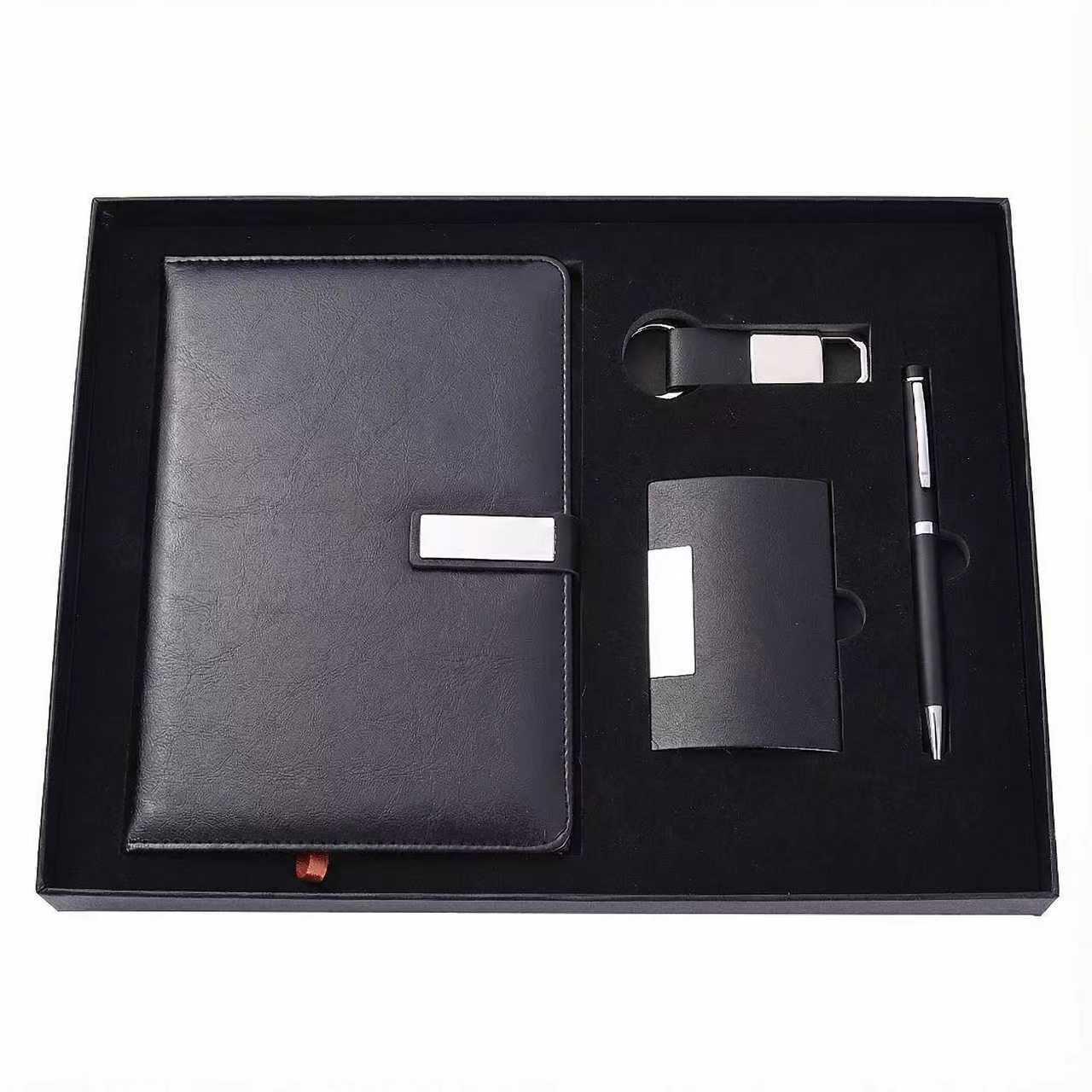 このビジネスオフィスギフトセットは、高級感のあるブラックレザーのベースにミニマルなメタルアクセントをあしらい、洗練されたプロフェッショナルなスタイルを演出しています。中には、ノート、USBメモリ、名刺入れ、ペンという4つの実用的なオフィス必需品が入っています。これらは、メモ取り、データ保存、ビジネスネットワーキングといった日常的なタスクをカバーします。統一されたブランドロゴが、セットの統一感とブランド認知度をさらに高めています。クライアントへの企業ギフトとして、従業員の福利厚生としてワークエクスペリエンスを向上させるために、あるいは洗練された個人用オフィスセットとして、その実用的な機能と高級感は、様々なビジネスシーンにふさわしいものです。