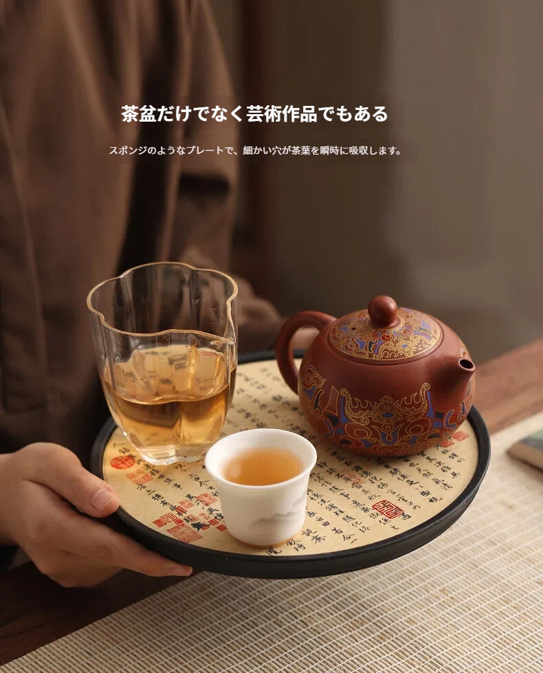 この吸水性のティートレイは、お茶会のために特別にデザインされた、ティーテーブルにぴったりの相棒です。高密度の珪藻土で作られており、抜群の吸水性を誇り、こぼれたお茶や洗い水を瞬時に吸収し、滴りやシミを残しません。これにより、滑りやすくべたつく表面がなくなり、長期間の水染みによる木製のテーブルへのダメージを防ぎます。トレイの縁は滑らかで快適な感触になるように細心の注意を払って磨かれており、底には滑り止めの微妙な突起があり、ティーペット、蓋碗、その他の茶器を置く際に安定します。毎日のお手入れは簡単です。吸収したお茶の残留物を叩き落とすか、きれいな水ですすぐだけです。乾燥させて最適な吸水性を取り戻します。また、美観と実用性を兼ね備えています。落ち着いたオフホワイトとライトグレーの色合いに、微妙なマット仕上げが組み合わされ、中国茶から日本茶まで、さまざまな茶道のスタイルにシームレスに溶け込みます。お茶の染みを目立たずに集めてテーブルを清潔に保つだけでなく、あらゆる茶道にミニマリストの美学を加え、お茶の時間をより楽しくリラックスしたものにします。