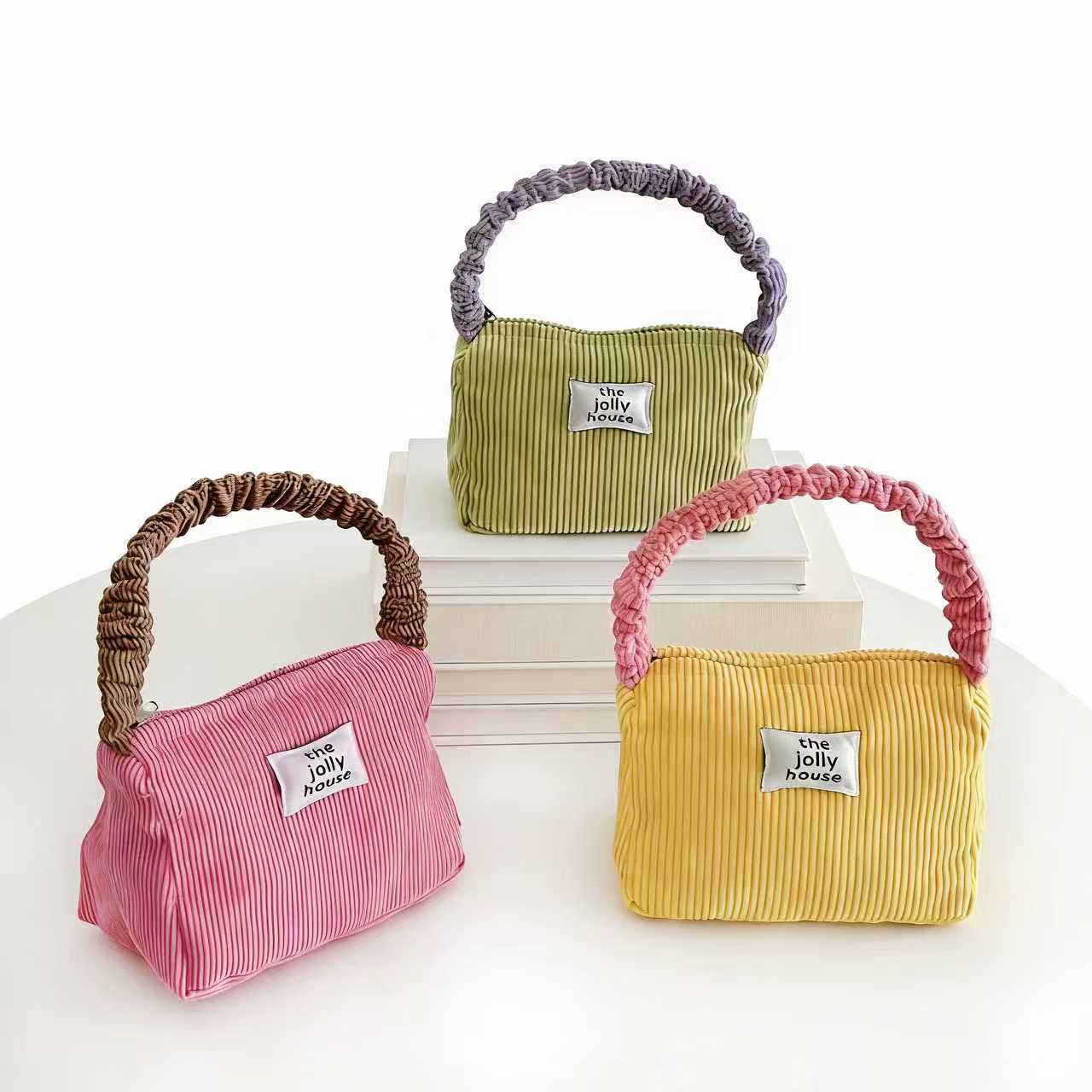 仕様:コーデュロイハンドバッグ カラー:グリーン、ピンク、イエロー 重量:約110グラム 素材:ポリエステル、コーデュロイ サイズ:Lサイズ 25×14×24cm、Sサイズ 14×24×14cm