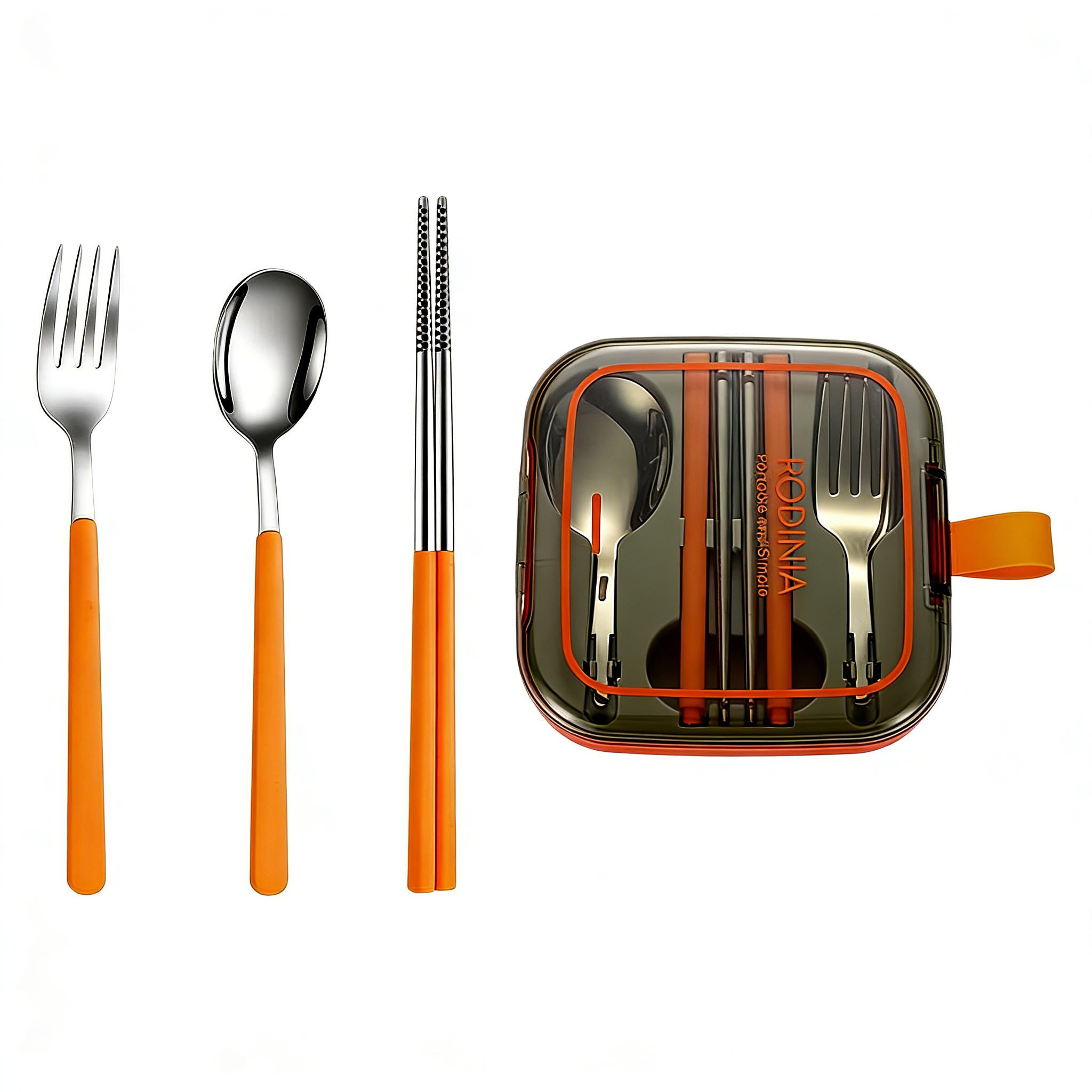 仕様:折りたたみ式ポータブルカトラリー カラー:オレンジグレー、イエローグリーン、スカイブルー 重量:約220グラム 材質:厚みのある304ステンレス鋼 サイズ:箸 20.5cm、スプーン 18×3.5cm、フォーク 11.5×2.2cm、ボックス 11.5×11.5cm