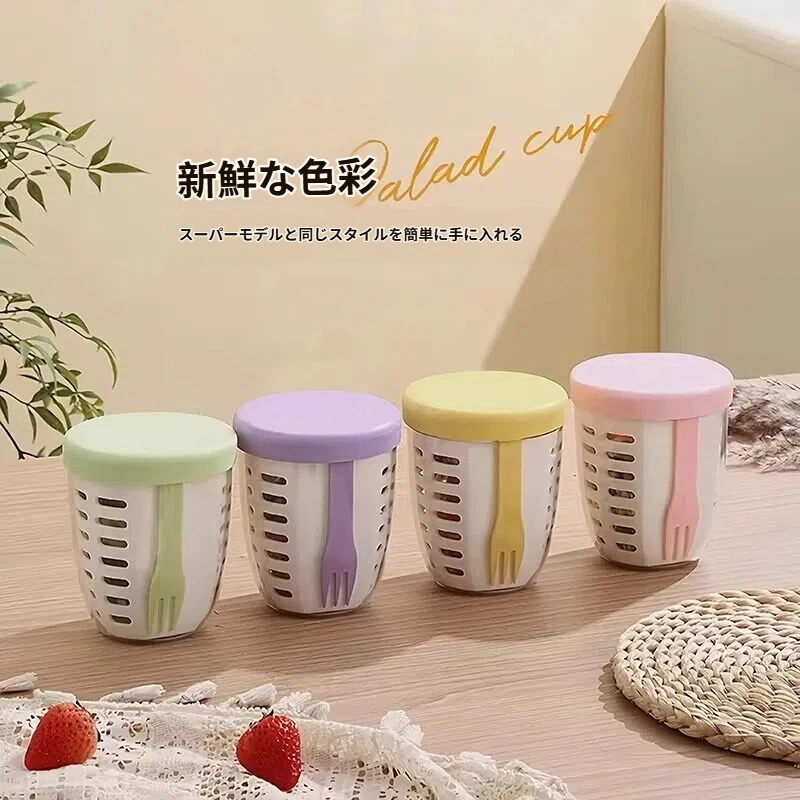 グリーン、パープル、イエロー、ピンクの爽やかなカラーが特徴のこの携帯用サラダカップは、「モデル御用達」の軽食ツールとしてデザインされています。カップには同系色のフォークが内蔵されており、取り出しやすく紛失防止のため蓋に収納されています。透明な本体と穴あきの外側のカバーは、見た目にも美しく、サラダやフルーツなどの軽食を入れるのに最適です。通勤時、アウトドアピクニック用の新鮮なフルーツの詰め合わせ、自宅でのちょっとした食事の準備など、持ち運びに便利なデザインと爽やかな外観、そして清潔感と利便性を兼ね備えたこのカップは、軽食好きの方にとってまさに必需品です。