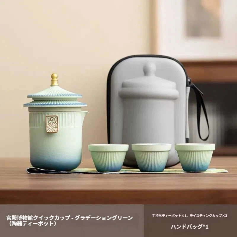 この携帯用茶器セットは、蓋に中国風の建築模様をあしらい、本体は爽やかな薄緑色の釉薬に篆刻模様が施されています。青緑色のグラデーションカップが3つ付属し、優雅な中国風の雰囲気を醸し出しています。付属の携帯用収納バッグはセット全体を簡単に収納でき、キャンプや出張など、様々なシーンで活躍します。いつでもどこでもお茶を楽しみたいというニーズを満たすだけでなく、その美しい外観は贈り物にも最適です。実用性と携帯性、そして中国の美意識を兼ね備えたお茶道具です。