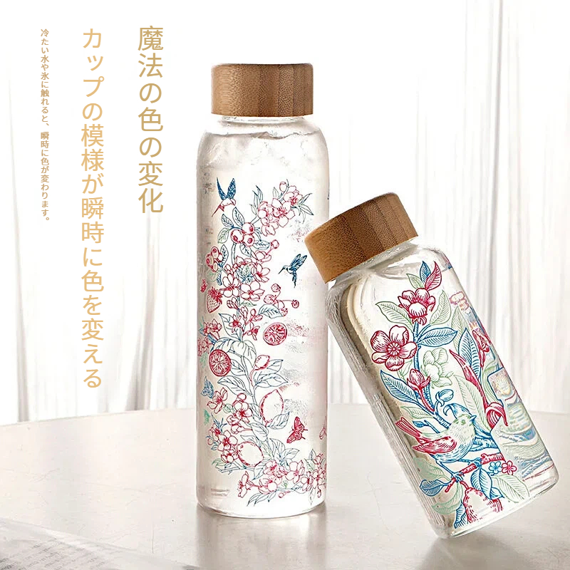 温度感応で色が変わるグラスは容量350ml。繊細な花鳥模様と竹の蓋で装飾され、上品な雰囲気を醸し出しています。独自の温度感応色変化技術により、温度変化によってダイナミックな視覚変化を楽しめます。持ちやすいサイズとグリップ感は、毎日の飲み物に実用的でありながら、個性的なデザインはインテリアとしても活躍し、生活に創造性と美しさを添えます。美しさと遊び心を兼ね備えた、トレンド感あふれるアイテムです。