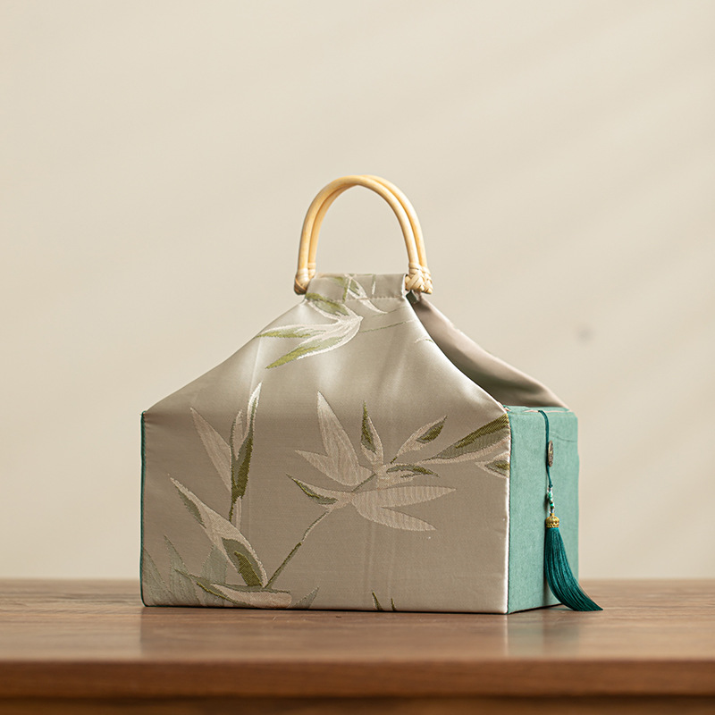 この中国風ハンドバッグは、質感のあるサテン生地に上品な竹の葉模様をあしらい、天然竹製の持ち手が付いています。赤、ベージュ、青など、上品なカラーバリエーションを取り揃えています。洗練されたデザインと持ち運びやすさを兼ね備えており、ギフト包装、お茶やお菓子の収納など、様々なギフトシーンで活躍するだけでなく、毎日の通勤やちょっとした荷物の持ち運びにも最適です。美観と実用性を兼ね備えた、中国らしい逸品です。