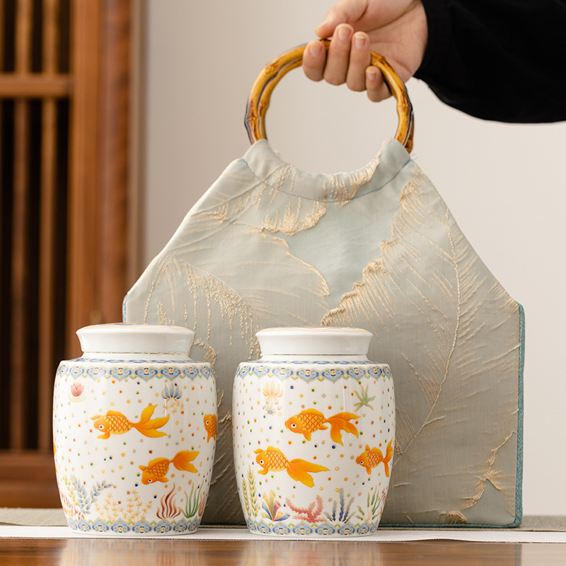 仕様:ダブルジャー用布袋 カラー:魚と海藻柄 重量:約900グラム 材質:陶器 包装:布袋 容量:900ml サイズ:ジャー11×14cm 布製バッグ 17×38.5×29cm