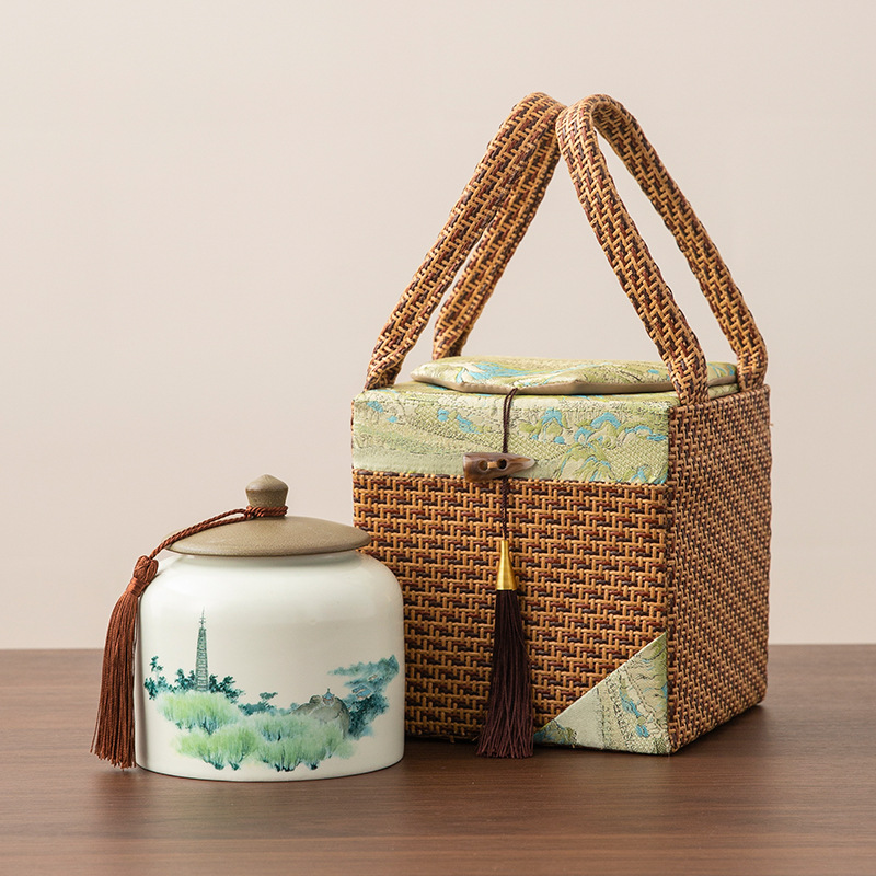 この籐製ギフトボックスは、天然の籐製バスケットに、風景模様のサテントリムとタッセルをあしらったデザインです。さらに、同じ風景模様の磁器製ジャー(木製の蓋とタッセル付き)もセットになっており、優雅で洗練された中国風の雰囲気を醸し出しています。バスケットは十分な収納力と便利な持ち手を備え、茶器、お菓子、その他のお土産の保管やギフトに最適です。屋外での茶会にもお使いいただけ、自然の風合いと伝統的な美意識が融合した実用的で便利なアイテムです。