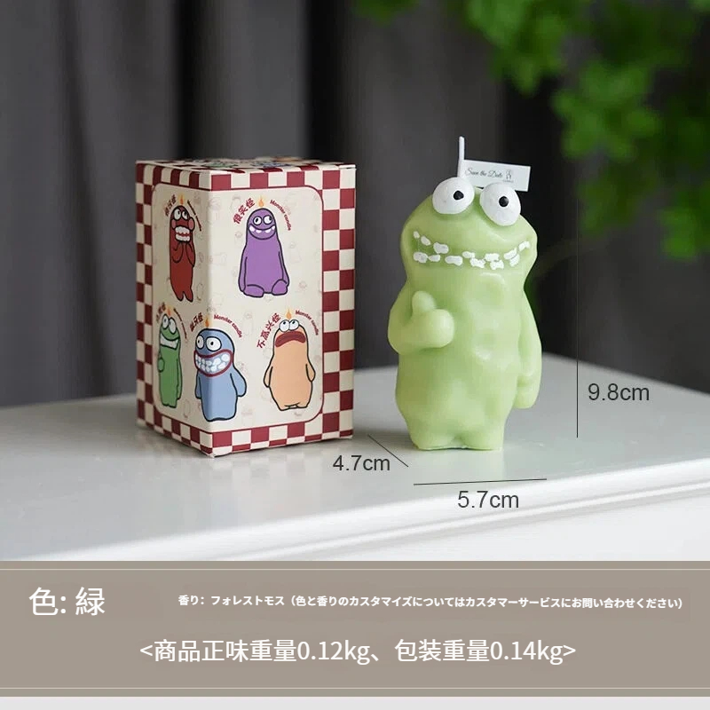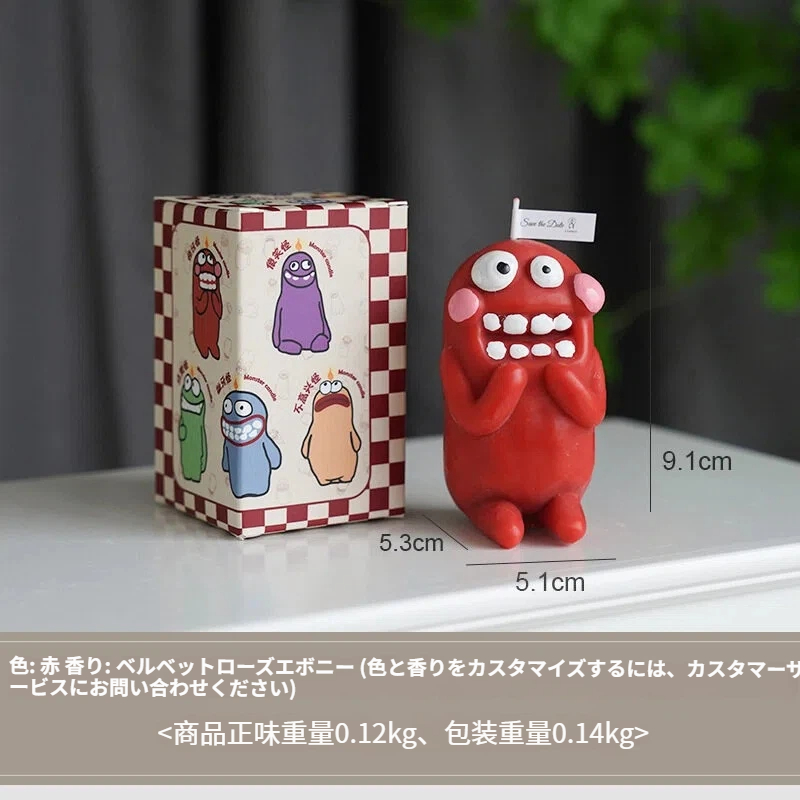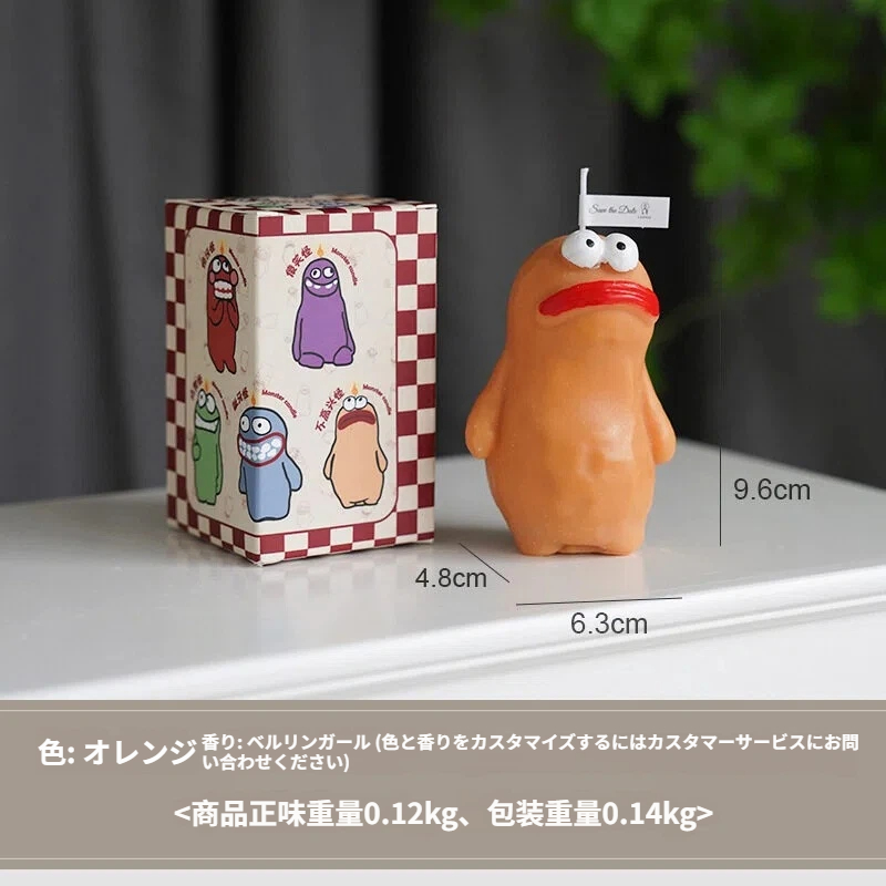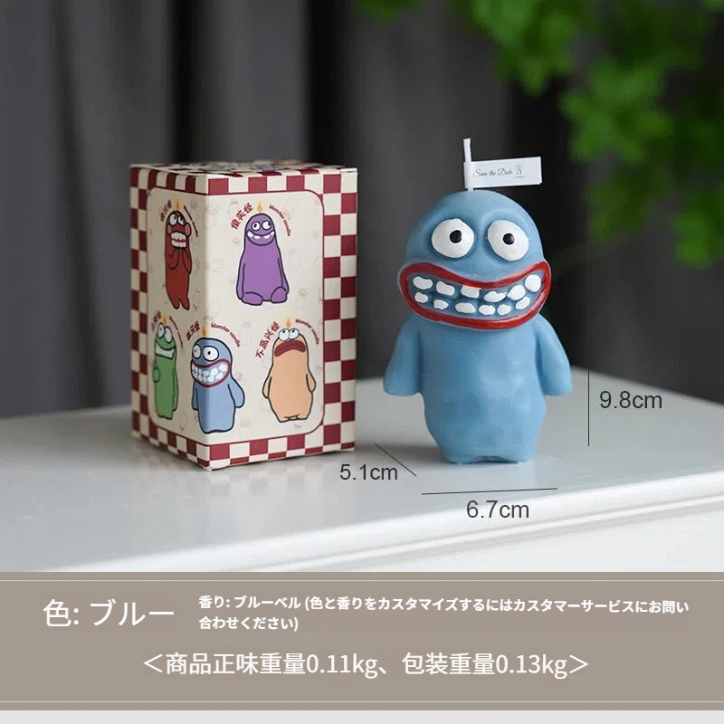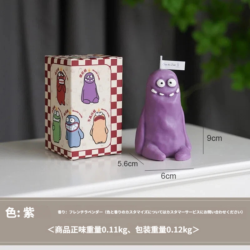 モンスターの形をした、ちょっと変わったアロマキャンドル。ニヤリと笑った歯と大きな丸い目が愛らしいデザインです。鮮やかな紫と青の色合いが目を惹きつけ、立体感のあるハンドメイドの質感が魅力を高めています。火をつけると、心地よい香りが広がります。寝室やデスクトップなど、様々な空間に最適です。フレグランスディフューザーとして空間を演出するだけでなく、遊び心のあるデザインでユニークなインテリアとしてもお楽しみいただけます。透明なギフトボックスに詰め込まれているので、ご自身で楽しむのはもちろん、キュートで遊び心のある気持ちを伝えるギフトとしても最適です。