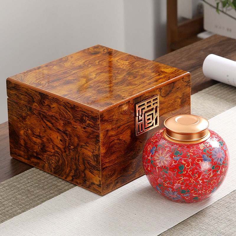 ホーロー塗装丸瓶(チャイニーズレッド、金属製スクリューキャップ)、木箱入り1個入り